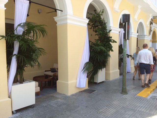 Las macetas y cortinas instaladas en tres de los arcos impiden el paso ya que debajo de la arcada se han instalado mesas y sillas, que formarían parte de la cafetería del hotel.