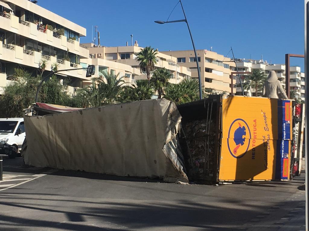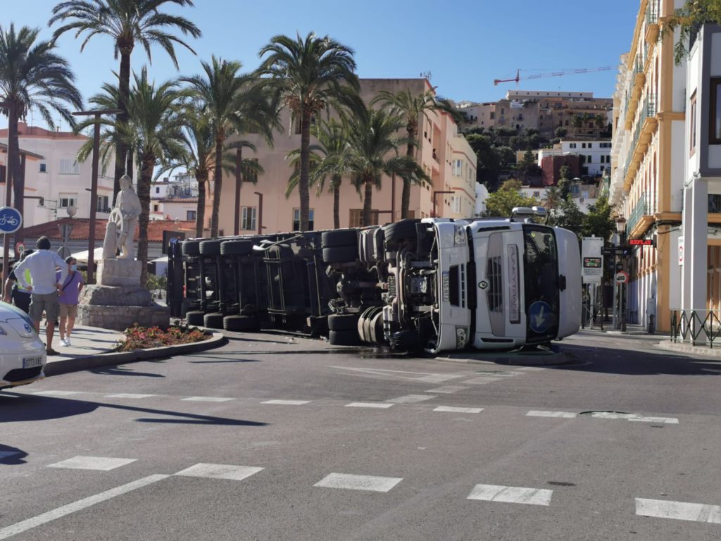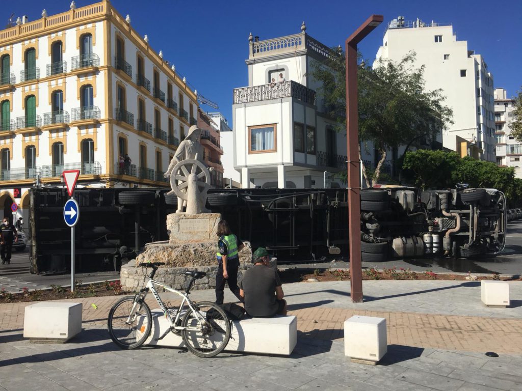 NouDiari / Un camión tractora con el remolque ha volcado esta mañana en el puerto de Ibiza, provocando el cierre del acceso a la zona portuaria de la Marina, como se aprecia en las imágenes que acompañan este texto. No ha habido heridos y el suceso ha ocurrido, al parecer, al pisar con las ruedas traseras del remolque la base de la estatua del Marinero, lo que ha hecho volcar al tráiler, propiedad de la empresa ibicenca Punkytrans.