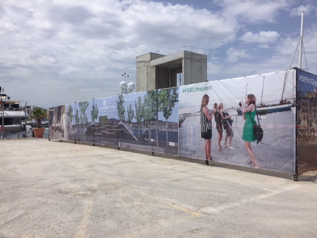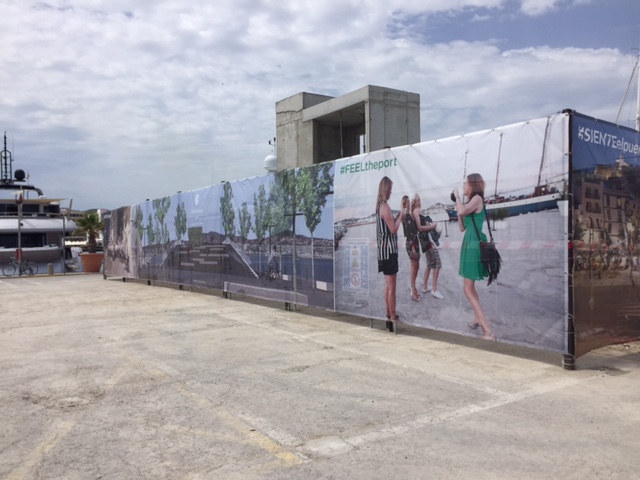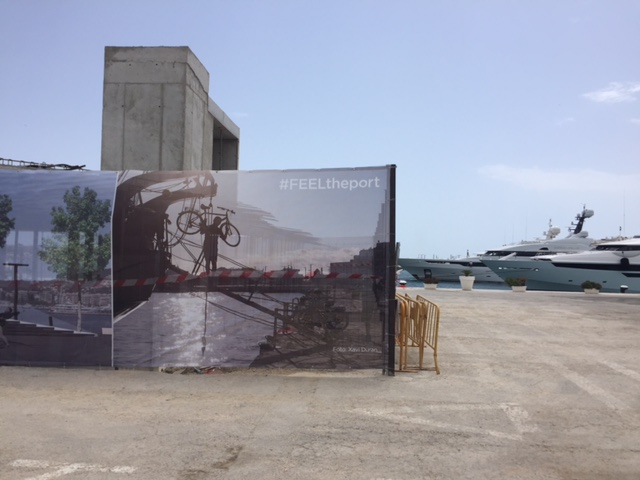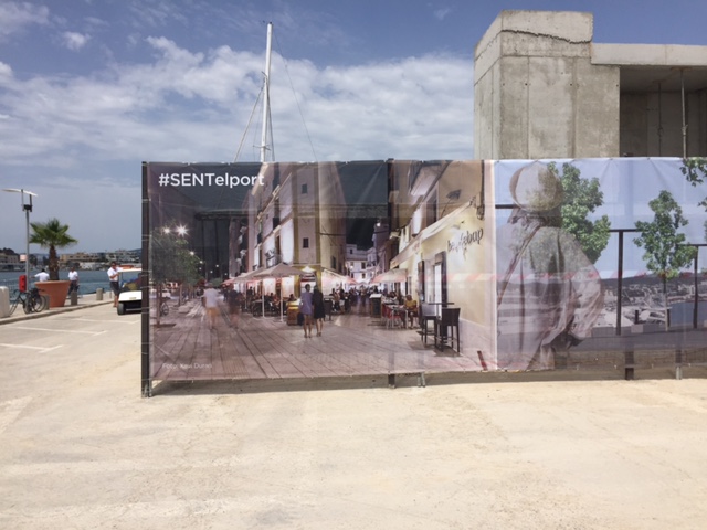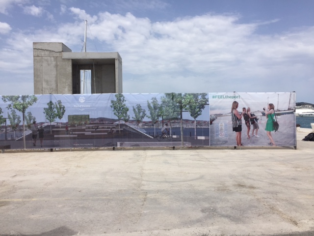 @Noudiari/ Los trabajos que se están llevando a cabo en la zona de Es Martell del puerto de Ibiza, donde antes estaban las oficinas de las compañías navieras ya parecen, a todas luces y desde la distancia, una obra totalmente acabada. La Autoridad Portuaria de Baleares ha instalado unas lonas cubriendo la maquinaria para dar al paseo un mejor aspecto durante los meses del verano, que simulan el aspecto final que tendrá la nueva plaza que se construirá en la zona.