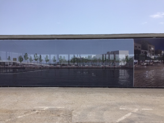 Las lonas instaladas para cubrir los restos del edificio se colocaron el pasado jueves y muestran, por un lado, el proyecto del futuro edificio y por otra, fotografías de personas disfrutando del paseo de la Marina que se estrenó hace ahora un año.