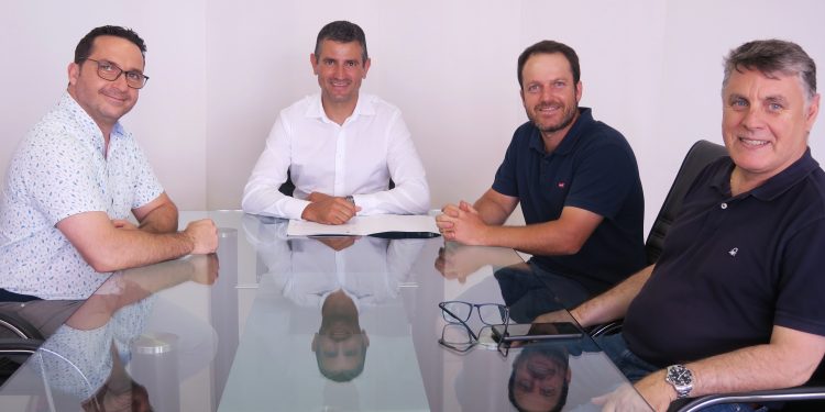 El acalde de Sant Antoni de Portmany, Marcos Serra, acompañado por el concejal de Sector Primario, Miguel Ángel Costa, y el presidente de la Cooperativa Agrícola de Sant Antoni, Toni Tur, junto al gerente Juan Antonio Prats,han firmado esta mañana el convenio de colaboración para el año 2024.