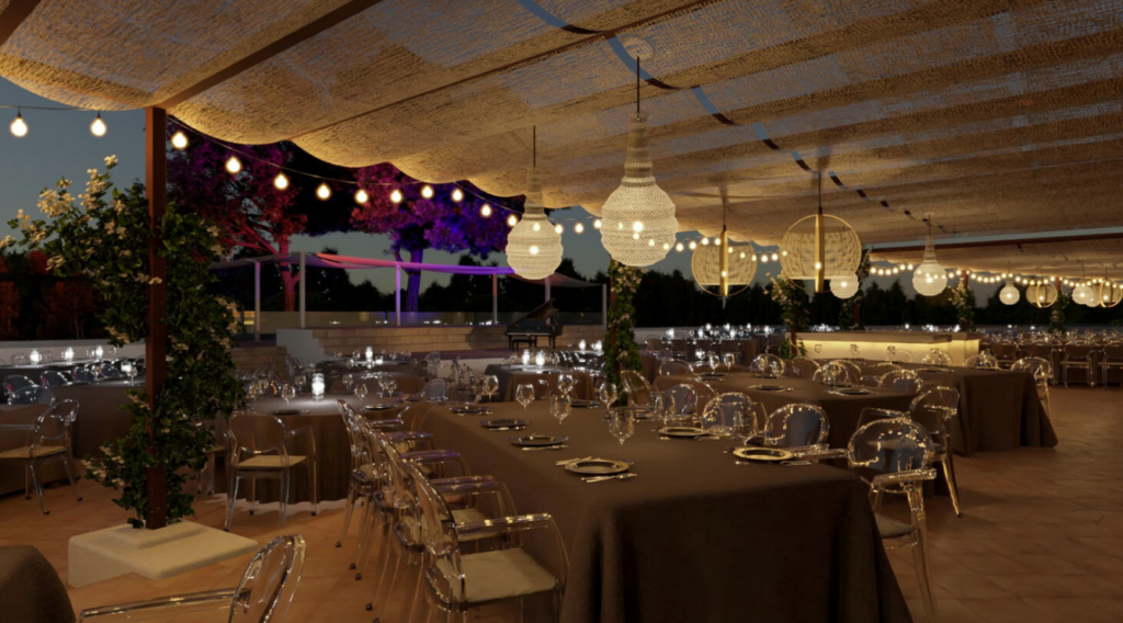 El espectacular elenco de artistas de Artful Entertainment y el staff dan la bienvenida a los invitados en la terraza, rodeada de verde, decorada de una manera muy natural y envuelta en los reflejos dorados de la tarde. Todo el estrés del día se ha quedado en la puerta. Ya solo queda dejarse llevar.