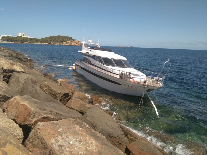 @Noudiari / Los servicios de emergencias han activado el Plan Cambal (Contaminación de Aguas Marinas de Baleares), por una embarcación de 16 metros que ha encallado en las rocas del exterior del puerto de Santa Eulària des Riu.