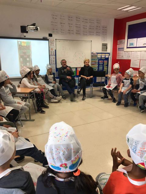 @R.N / Una veintena de alumnos de infantil y primaria del CEIP Sant Antoni han recibido esta mañana en su clase la visita de Susi Díaz y Paco Torreblanca, dos de las estrellas que participaron al IV Foro de Gastronomía del Mediterráneo. Los pequeños habían preparado un trabajo especial sobre los chefs invitados al Foro y un regalo que no pudieron entregarles al no coincidir la llegada de sus vuelos con la visita de los niños al Foro.