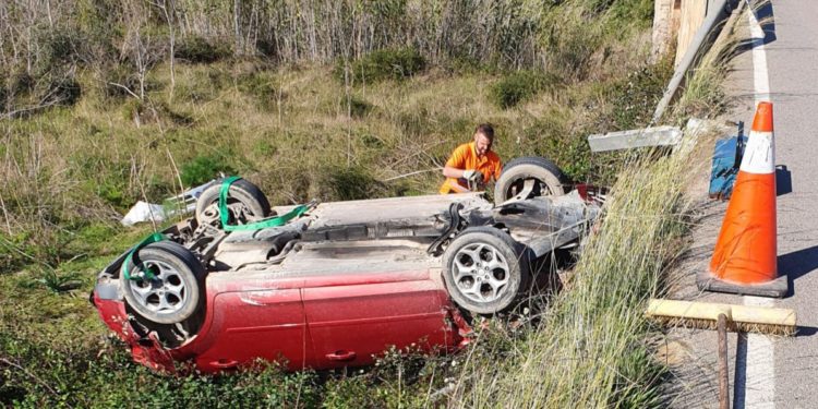 Así, un Ford Focus de color granate se salió de la vía por razones que se desconocen, rompió el guardarraíl del lado izquierdo de la carretera, a la altura del torrente, y, en la caída, dio una vuelta y quedó con las ruedas hacia arriba.