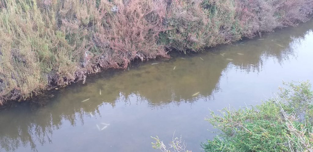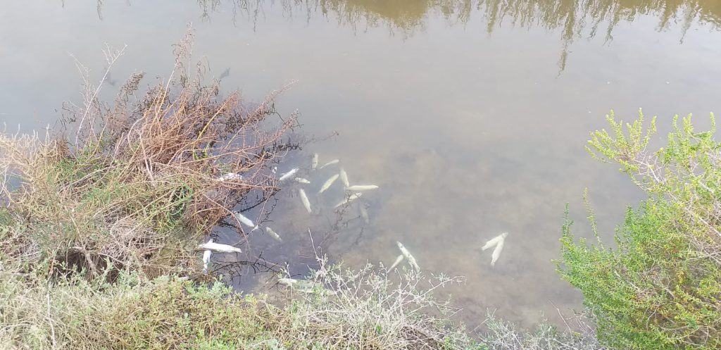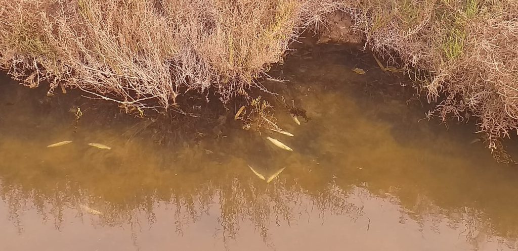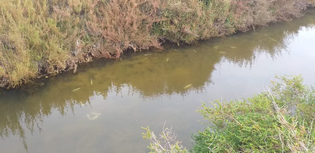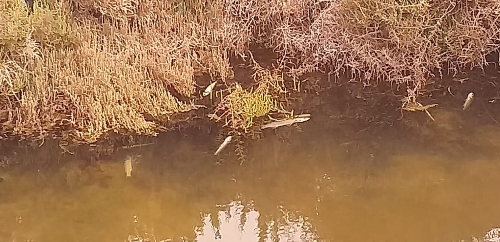 @Noudiari / Los canales del humedal de Platja d’en Bossa muestran una imagen desoladora: decenas de peces muertos.