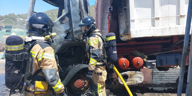 Arde por completo la cabina de un camión dedicado a la retirada de posidonia en Santa Eulària
