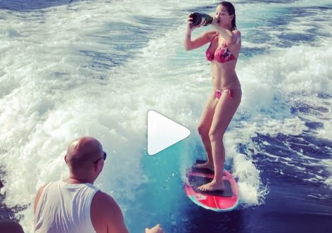 @Noudiari / La modelo francesa Aurelia Chenat lo ha vuelto a hacer. Esta vez en Ibiza y con mayor éxito que en China, cuando se cayó de la tabla de surf con un botella de vino que se iba tomando sorbo a sorbo y cuyo contenido, no obstante, no llego a perderse.