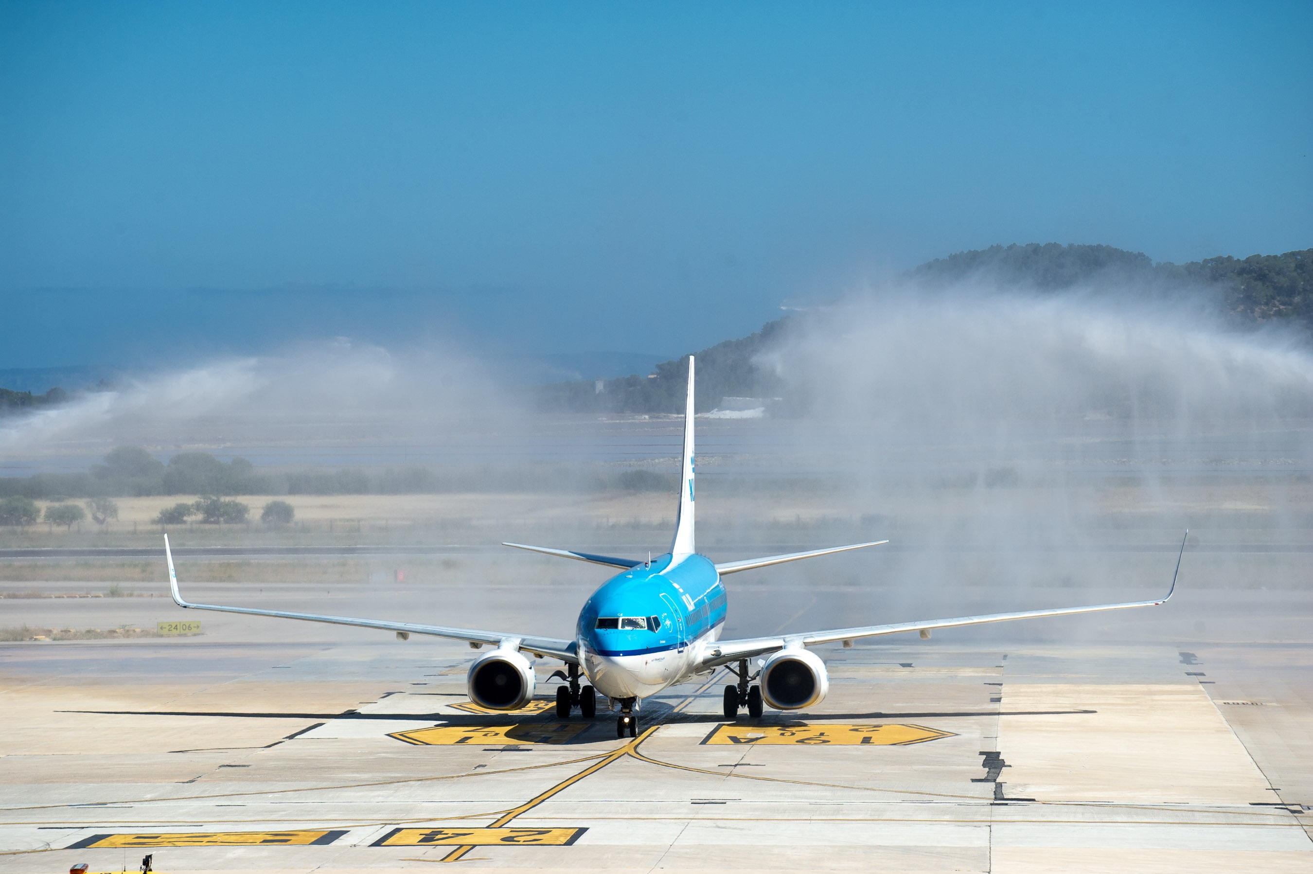 @Noudiari / A las 15,50 horas de esta tarde, con 20 minutos de antelación sobre el horario previsto, el primer vuelo de KLM Real Compañía Holandesa de Aviación de la ruta entre Ámsterdam e Ibiza (KL1717) ha aterrizado en el aeropuerto de la isla Pitiusa. El avión, un Boeing 737-700, ha tomado tierra con 126 pasajeros a bordo y ha sido recibido por los bomberos del aeropuerto con la tradicional ceremonia de arco de agua.