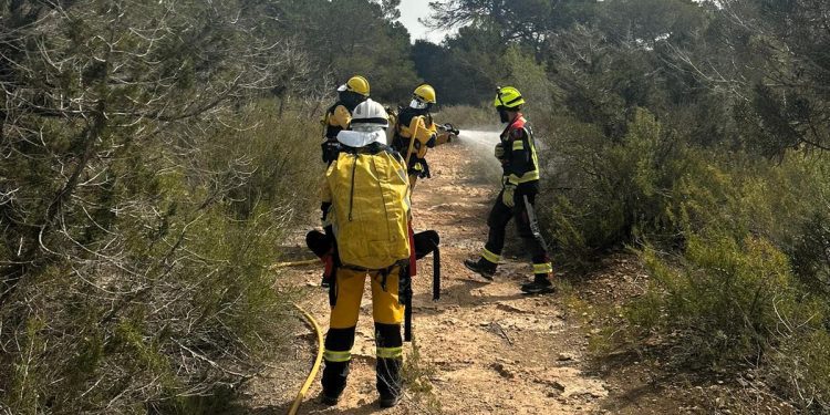 Los bomberos de Formentera y personal del Ibanat han realizado una práctica conjunta para preparar la campaña de prevención de incendios. Han participado seis efectivos de bomberos y cuatro efectivos de Ibanat.