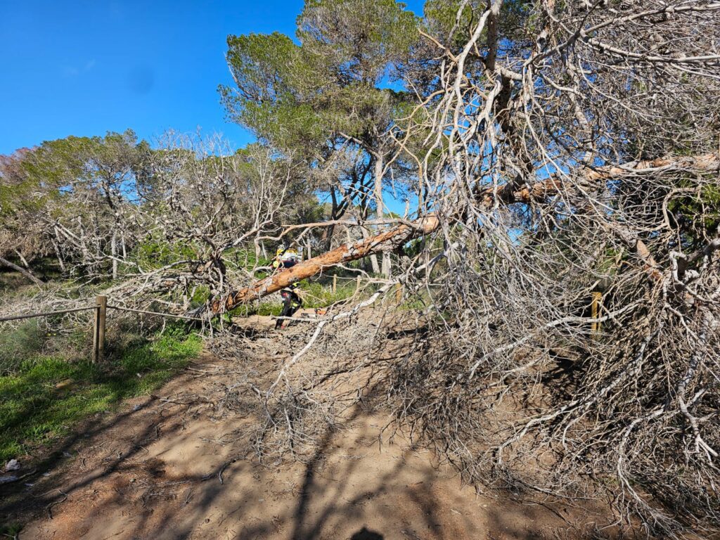 El domingo por la mañana, el 112 informó recibió también el aviso de caída de un pino sobre el camí vell de Cala Saona, que quedó obstaculizado. Los Bomberos procedieron a liberar el camino y reestablecer el acceso esa misma mañana.