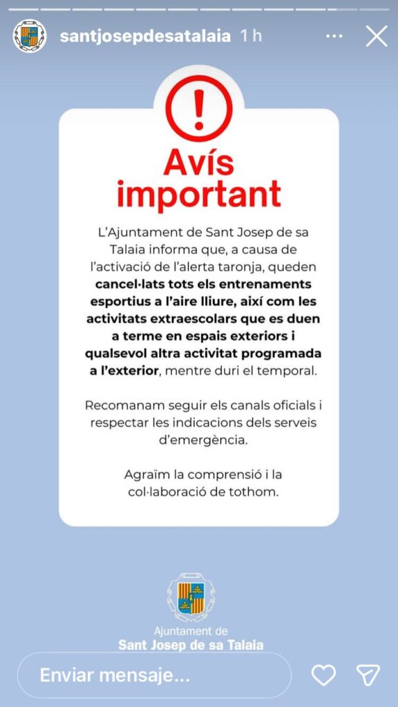 Con la activación del aviso naranja, y la predicción de rachas de viento de hasta 90 km/hora, el ayuntamiento de Sant Josep ha publicado este aviso importante que también afecta «a cualquier tipo de actividad programada en el exterior» mientras la borrasca Joseph siga azotando la isla.