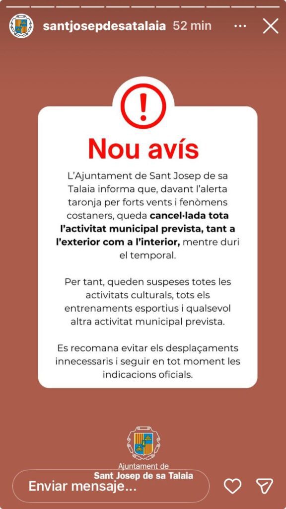 Con la activación del aviso naranja, y la predicción de rachas de viento de hasta 90 km/hora, el ayuntamiento de Sant Josep ha publicado este aviso importante que también afecta «a cualquier tipo de actividad programada en el exterior» mientras la borrasca Joseph siga azotando la isla.