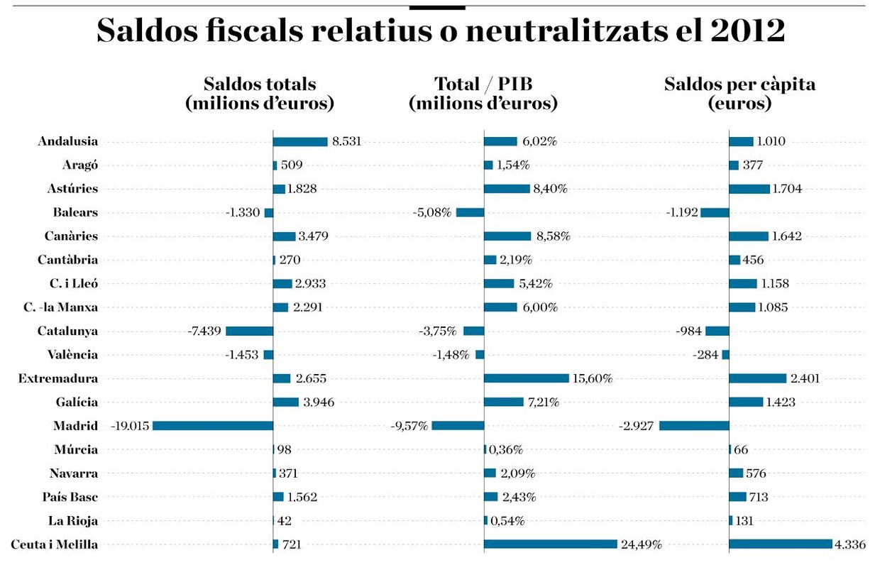 Segons l’anàlisi, el saldo total en relació al PIB de la resta de comunitats autònomes és positiu, i encapçalen la llista Ceuta i Melilla (24,49%), Extremadura (15,60%), Canàries (8,58%) i Astúries (8,40%).