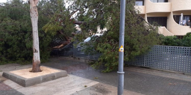 Un pino situado en los jardines de un edificio de apartamentos de la calle Burgos de Cala de Bou, Sant Josep, ha caído esta tarde sobre dos coches que estaban estacionados, causando graves desperfectos en uno de ellos, según señalan desde el Parque Insular de Bomberos, cuyos efectivos se han tenido que desplazar hasta el lugar para talar y recoger la parte del árbol que ha quedado en la vía pública.