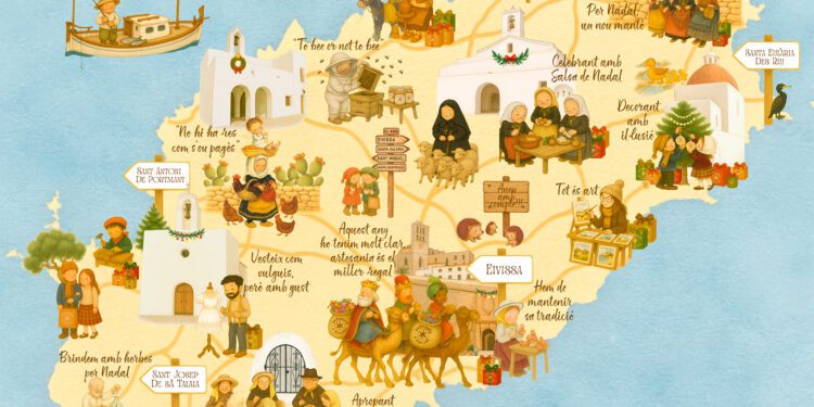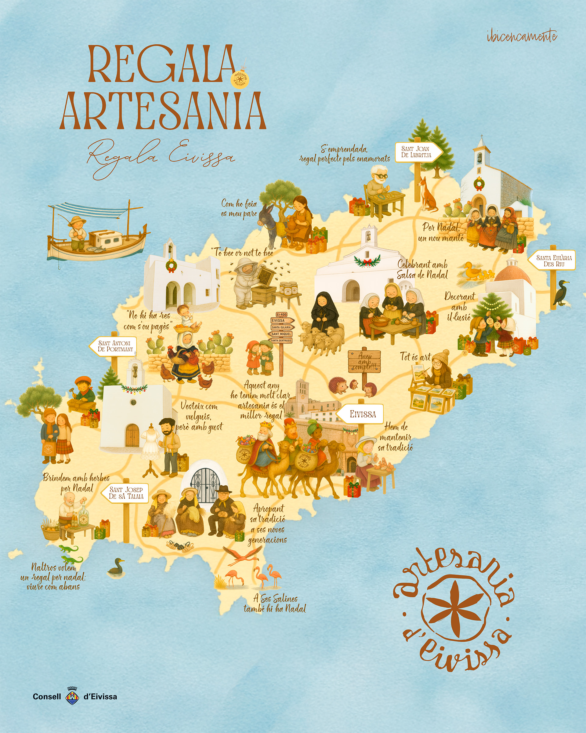 La consellera de Promoción Económica, Cooperación Municipal y Recursos Humanos, Maria Fajarnés, ha explicado que la campaña de esta Navidad busca conectar con las tradiciones y la esencia de Ibiza a través de mensajes y dibujos que reflejan el día a día más auténtico, con lemas como ‘celebrant amb Salsa de Nadal’, ‘per Nadal un nou mantó’, ‘brindem amb herbes per Nadal’ o ‘no hi ha res com s’ou pagès’.
