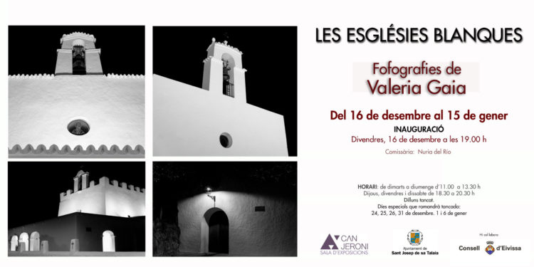 L’Ajuntament de Sant Josep de sa Talaia inaugura l’exposició ‘Les esglésies blanques’, amb fotografies de Valeria Gaia, a la sala d’exposicions del Centre de Cultura Can Jeroni aquest proper divendres, 16 de desembre, a les 19 hores, dins el programa de les festes de Nadal i Cap d’Any. La mostra, organitzada pel Consell d’Eivissa, és un recorregut a través de 50 imatges per les 17 esglésies rurals de l’illa a través de la mirada personal de la creadora italiana i es podran visitar fins el 15 de gener.