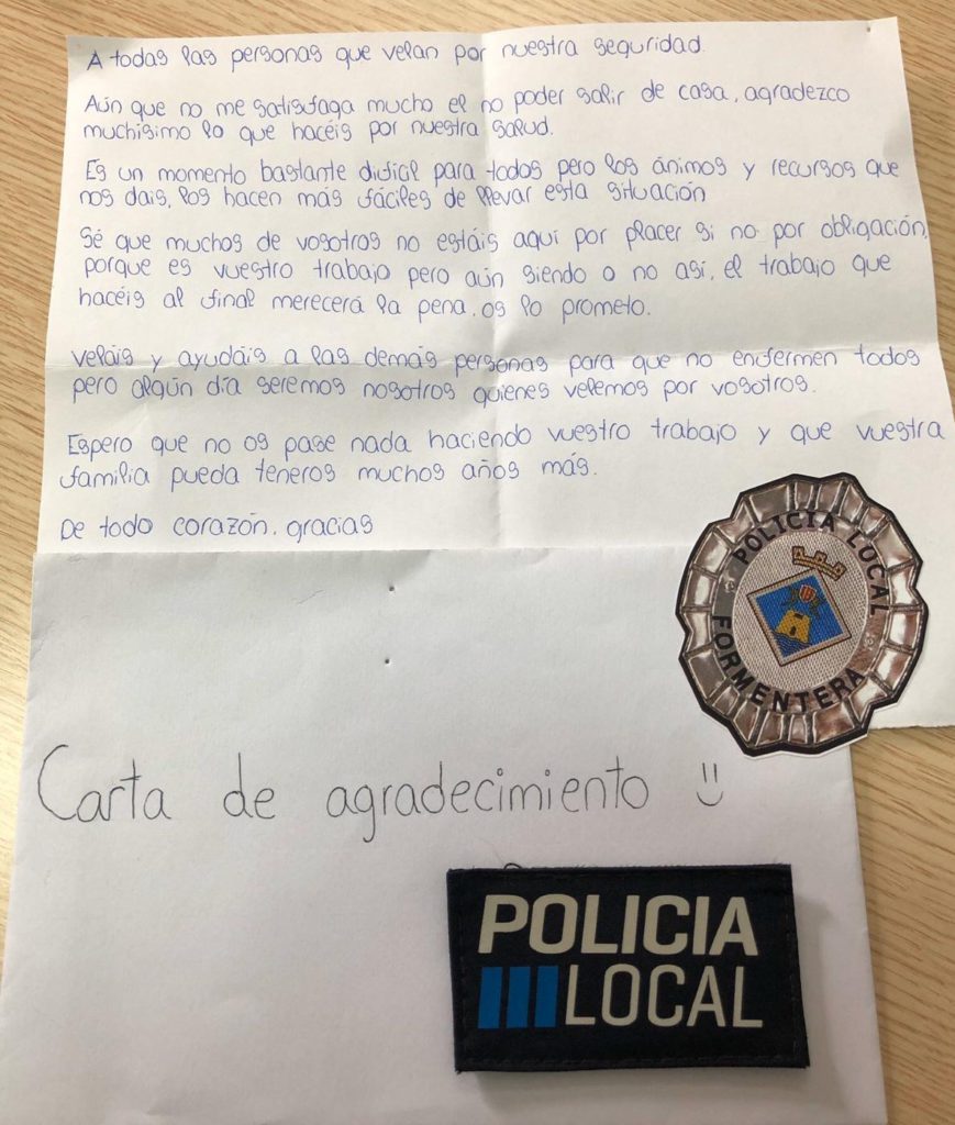 @Noudiari / La Policía Local de Formentera ha recibido una carta muy especial en agradecimiento a su labor, se trata del escrito de una niña de la isla que se lo hizo llegar a unos agentes cuando patrullaban la ronda informativa con los megáfonos, según informa el Consell de Formentera en sus redes sociales.