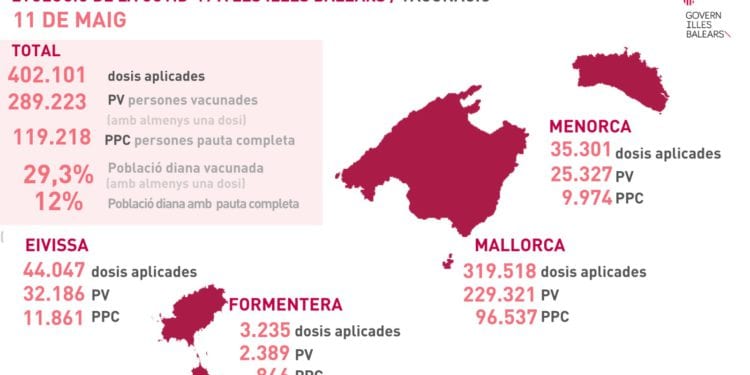 Las Islas Baleares han alcanzado el 12% de la población inmunizada al contar con 119.218 personas con la pauta de vacunación completa, hasta este 11 de mayo. En las islas se han aplicado ya un total de 402.101 dosis de las vacunas contra el Covid. En cuanto a la población diana vacunada con la primera dosis se trata del 29,3% de los baleares.