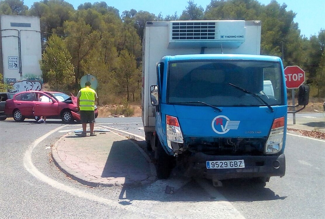 @Noudiari / Un turismo y un camión han colisionado poco después de las dos de la tarde en la carretera de Santa Eulària, a la altura del cruce con la carretera de Sant Miquel (Can Clavos).
