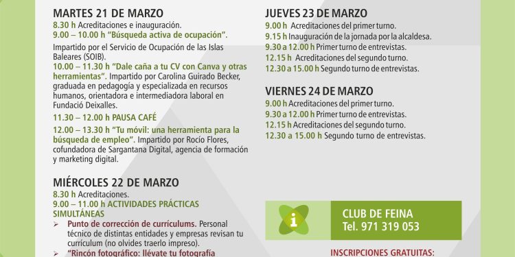 El certamen de búsqueda de empleo Santa Eulària Se n’Ocupa ofrece en la presente edición más de 2.700 puestos de trabajo presentados por más de un centenar de empresas. Pero Santa Eulària Se n’Ocupa no sólo son las dos jornadas (23 y 24 de marzo) de entrevistas exprés para conseguir un puesto de trabajo. Los dos primeros días, los interesados en los talleres y conferencias pueden inscribirse, también gratuitas, para mejorar la confección de sus currículums y cómo afrontar con más seguridad los procedimientos de selección. Este año, como principales novedades, habrá la posibilidad de hacerse una foto ‘profesional’ para adjuntar en los currículums o perfiles de búsqueda de empleo, así como una conferencia del consultor Rubén Montesinos con claves para no ser un ‘The Working Dead’ o ‘zombi laboral.