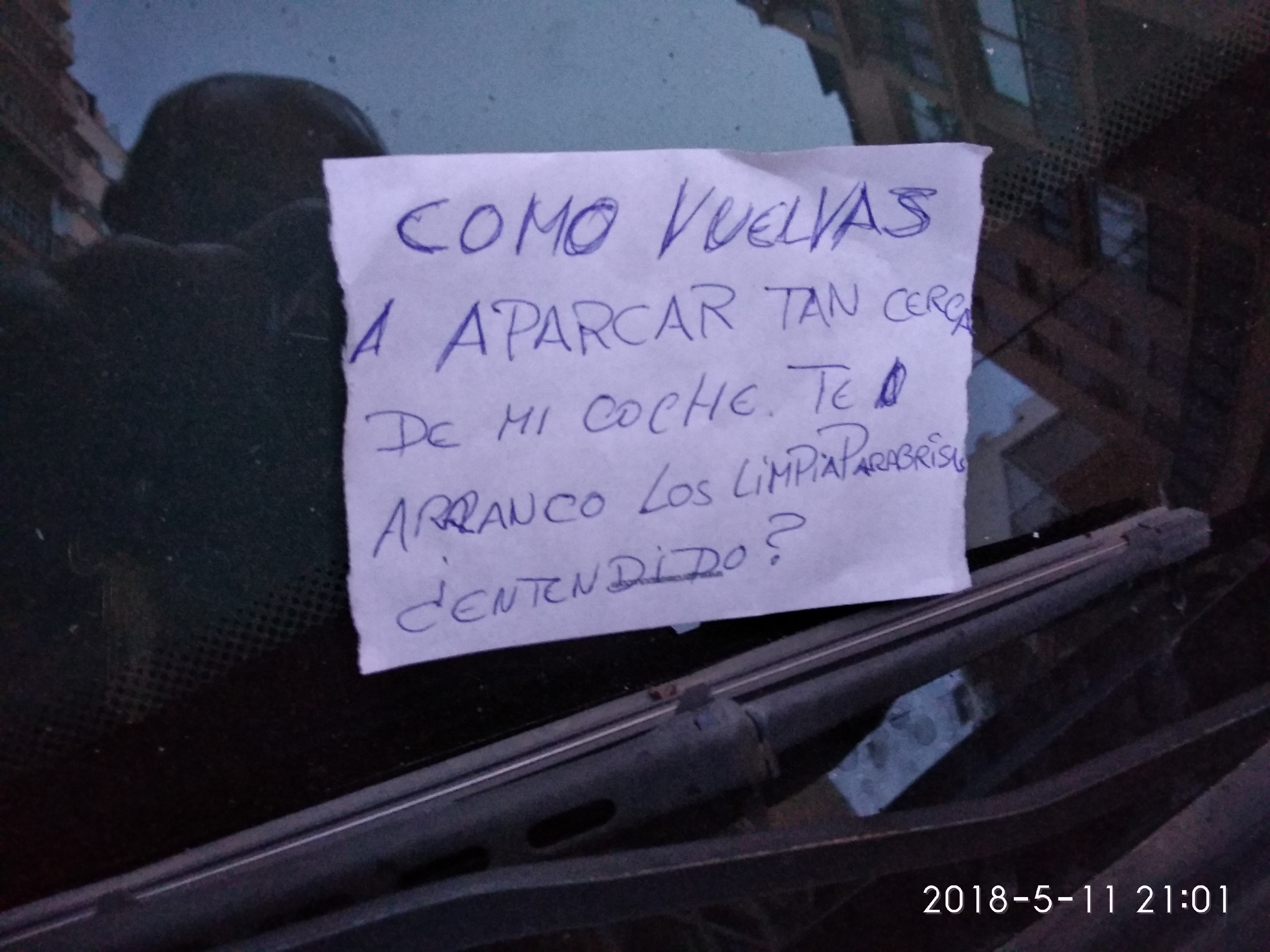@Noudiari / Hay maneras y maneras de decir las cosas. Desde luego, la que emplea un conductor para dirigirse a otro de la calle Juan de Austria de Ibiza, con una nota colgada en el parabrisas del vehículo, no parece la más correcta. En la misma puede leerse el siguiente mensaje: «Como vuelvas a aparcar tan cerca de mi coche, te arranco los limpiaparabrisas. ¿Entendido?». El volante, sin duda, nos transforma y a veces nos conduce a la violencia vial.