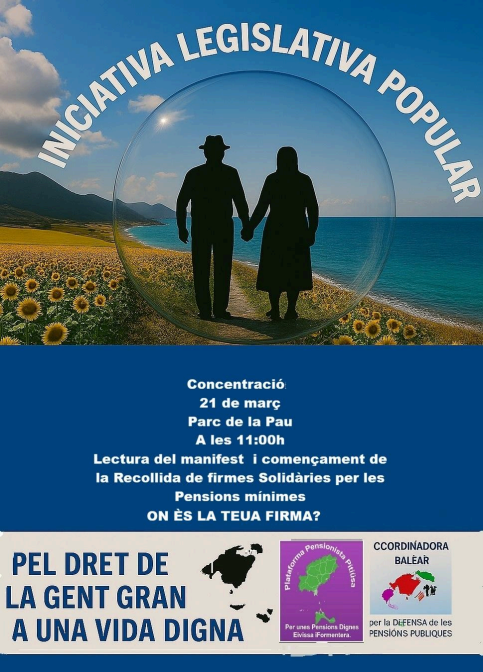 La ILP propone la creación de un sistema balear de complemento de pensiones que garantice que todas las personas pensionistas mayores de 60 años, residentes y empadronadas en las Illes Balears, reciban unos ingresos mínimos equivalentes al 100 % del Salario Mínimo Interprofesional (SMI), actualmente de 1.221 euros, tanto para pensiones contributivas como no contributivas.