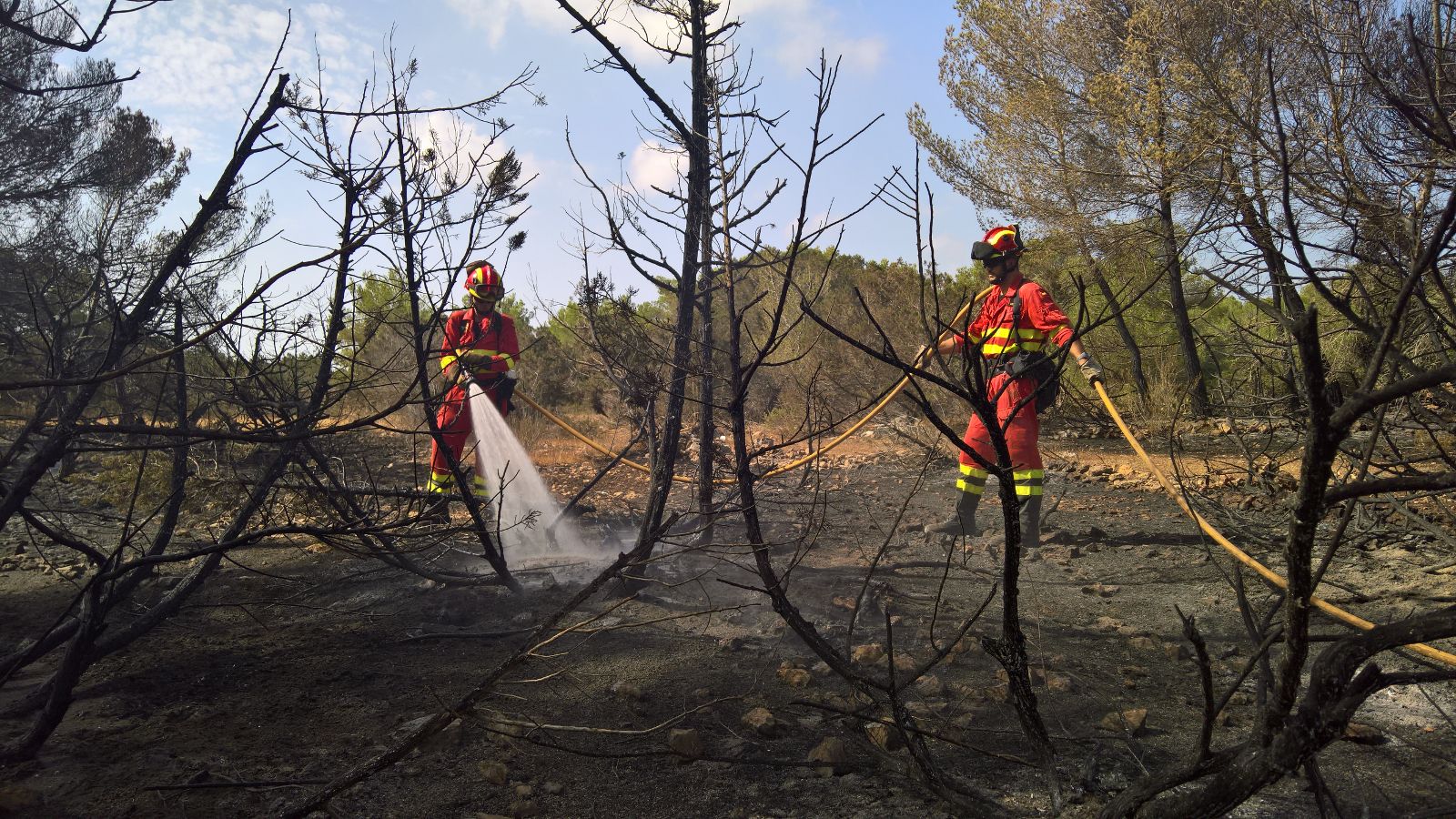 Tanto miembros de la Unidad Militar de Emergencias (UME), llegados de la base de Bétera (Valencia), como los bomberos del Consell de Formentera siguen en el lugar refrescando la zona para dar por extinguido el incendio.