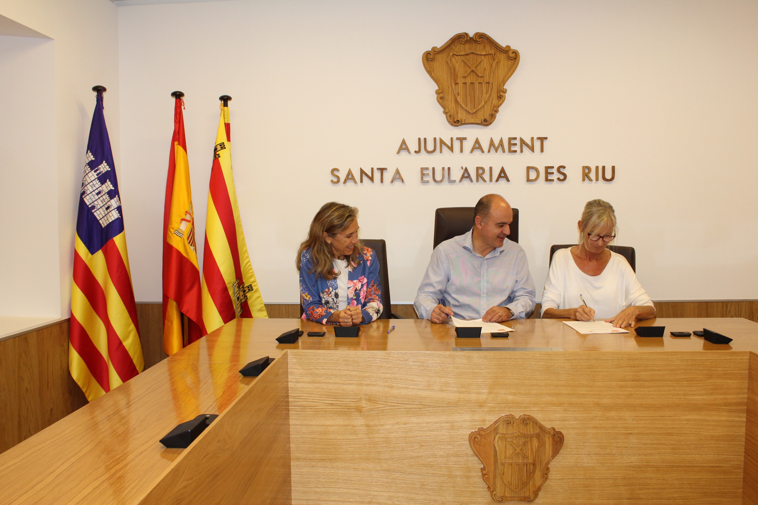 L’alcalde de Santa Eulària des Riu, Vicent Marí, i la presidenta de la comunitat de propietaris de ‘es Mercat’, Gabriela Jodexnis, han ratificat aquest acord que implicarà una subvenció per part del Consistori de 3.500 euros, equivalent al 50% del cost estimat d’aquest pla de digitalització i que ha estat definit des de l’ens que engloba als comerciants que venen a aquest espai del carrer Sol de Santa Eulària com una iniciativa que “compren la dinamització de diferents xarxes socials de les que es disposen (Facebook, Twitter i Instagram) i una renovació de la imatge de la web www.esmercatdesantaeulariadesriu.com”.