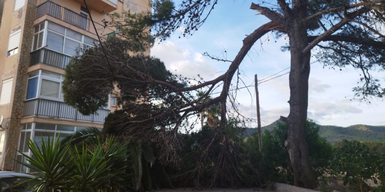 Efectivos del Parque Insular de Bomberos han cortado esta tarde una rama de un pino de grandes dimensiones que se había quebrado y amenazaba con caer sobre una zona de paso hacia la playa de es Codolar junto a los edificios Don Pepe. Las tareas se han prolongado desde poco después de las cuatro de la tarde hasta casi las siete. Con esta intervención, se ha evitado que la rama cayera sin control. El viento ha sido el detonante de esta situación, que podría repetirse en las próximas horas en diferentes puntos de la isla, puesto que la previsión meteorológica anuncia vientos de entre 60 y 80 kilómetros por hora para este lunes tanto en Ibiza como en Formentera. El aviso también recalca la posibilidad de que se produzcan chubascos ocasionales que podrían ser de intensidad.