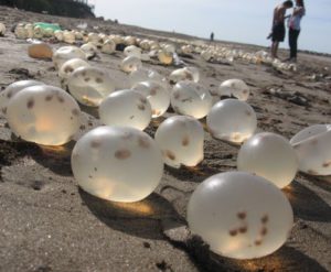 Realmente no son huevos en sí mismos, si no ovicápsulas de 4 a 8 centímetros de diámetro, una especie de burbujas que protegen, a entre 10 y 30 embriones que hay dentro, de los depredadores, cambios de temperaturas, ataques de bacterias… y que además les sirve para alimentarse, ya que también contienen un líquido rico en proteínas y carbohidratos. Estas estructuras las crean los gasterópodos, en este caso, el caracol marino llamado Adelomelon Brasiliana y, a diferencia de otras ovicápsulas, no se adhieren a sustratos marinos, si no que vagan libres por el océano, así aseguran su dispersión, pero al hacerlo también corren el riesgo de que por acción de las mareas o los vientos acaben en alguna de las playas que van de Venezuela a Argentina, si no, lo normal es que estas cápsulas se abran y los pequeños caracoles naden libres en el océano.