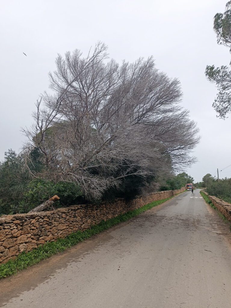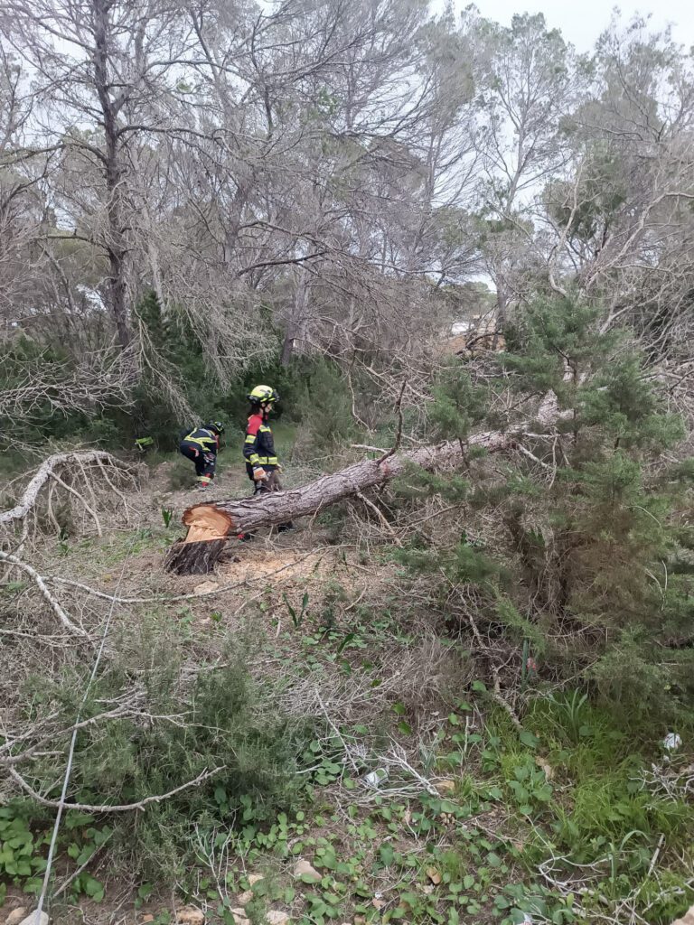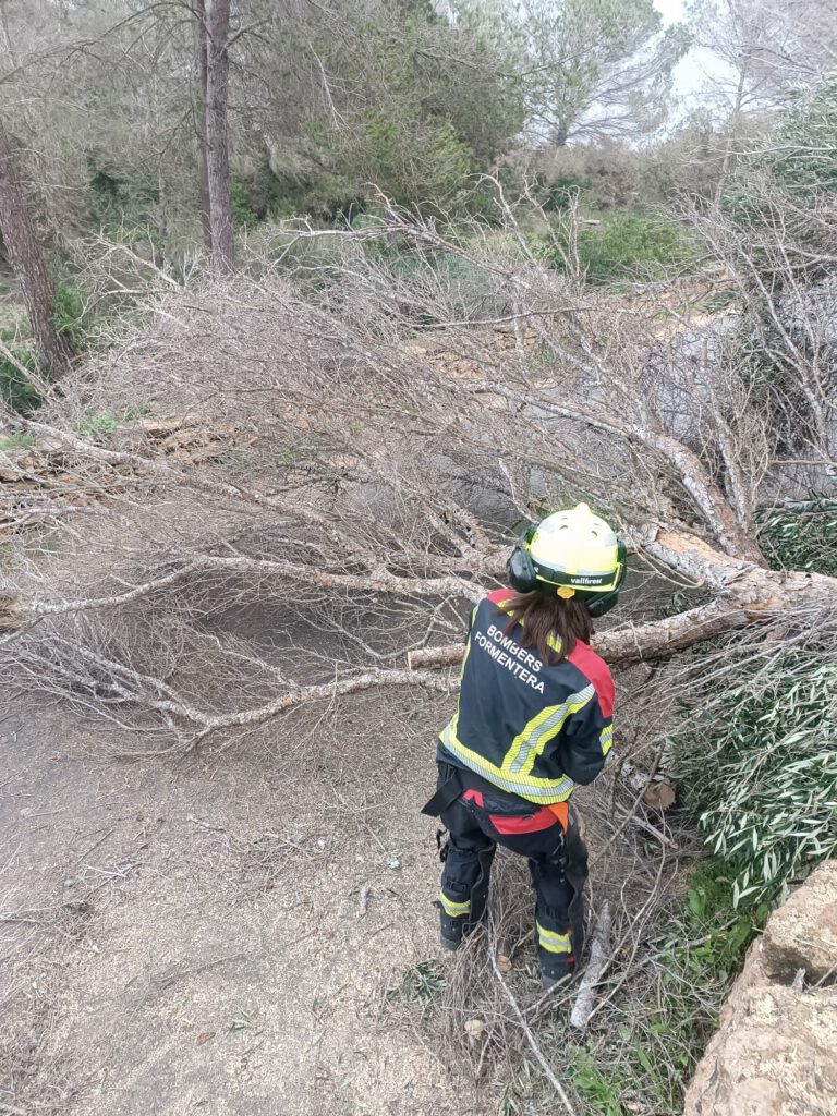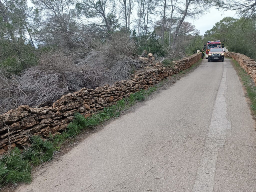 El martes 27 de enero, a partir de las 10.30 horas, los bomberos realizaron tres servicios. Dos de ellos estuvieron relacionados con la caída de pinos: un pino apoyado sobre el cableado eléctrico en la zona del Port de sa Saler, y tres pinos caídos que ocupaban parte de la calzada en el camí vell de la Mola, pasado el campo de fútbol.