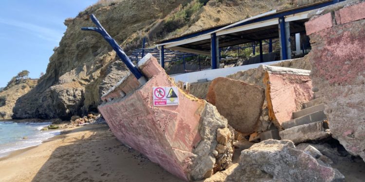 El PSOE ha denunciado en un comunicado la peligrosidad del quiosco derrumbado en s’Aigua Blanca tras los temporales marzo y abril de este año y exige al Ayuntamiento de Santa Eulària que actúe para restituir la playa a su estado natural.