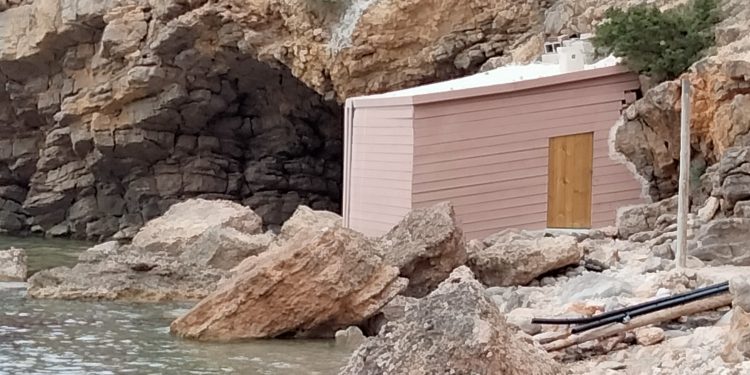 Varias personas han denunciado la aparición de una «presunta» caseta varadero o de pescadores junto al mar en la bahía de Porroig, en el municipio ibicenco de Sant Josep. Según explican, la construcción ha aparecido «de la noche a la mañana», se ha hecho «deprisa y corriendo, en muy poco tiempo», y, como se aprecia en las imágenes que acompañan estas líneas, produce un fuerte impacto visual. Es de madera, entre otros materiales, de un color rojizo y se encuentra pegada al mar. Las personas que informan sobre esta caseta señalan «que destruye parte del ecosistema» de Porroig, y que en la instalación de la misma se ha empleado «una importante cantidad de cemento», como se ve en la base sobre la que se asienta.