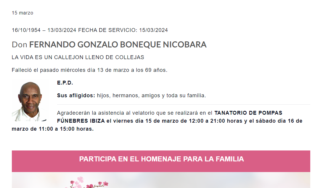 Todas las personas que quieran dar su último adiós a Fernando, que falleció ayer en su casa a los 69 años de edad, tendrán la oportunidad de hacerlo durante los dos días de velatorio de cuerpo presente que se le han preparado en Pompas Fúnebres Ibiza durante el viernes (de 12 a 21 horas) y el sábado (de 11 a 15 horas).