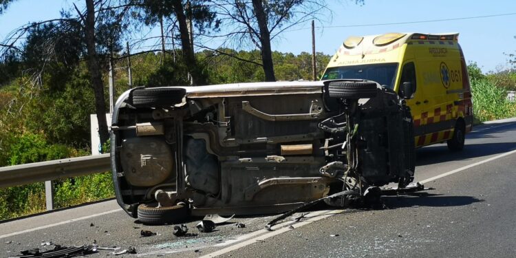 El conductor del coche volcado, un hombre de nacionalidad española, sufrió un traumatismo abdominal grave y fue trasladado al Hospital Can Misses con código politrauma grave activado por la Central de Coordinación del 061. Su acompañante, de nacionalidad alemana, presentaba una posible fractura de pelvis y fue derivada a la Policlínica Nuestra Señora del Rosario.