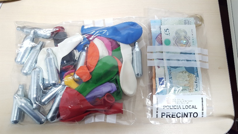 En torno a las 3.30 horas se practicó la segunda detención, después de que los agentes observaran a través de las cámaras de video vigilancia a otra persona que se dirigía a unos turistas sentados junto a la parada de taxis del paseo, hinchaba varios globos con óxido nitroso y se los vendía.