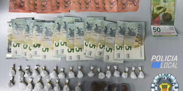 La Policía local de Santa Eulària detuvo ayer jueves, día 16 de enero, a tres personas por un presunto delito contra la salud pública. Se intervinieron en dos operativos diferentes un total de 34 envoltorios de cocaína, 3 placas de hachís, 1.470 euros y un dispositivo móvil presuntamente robado.