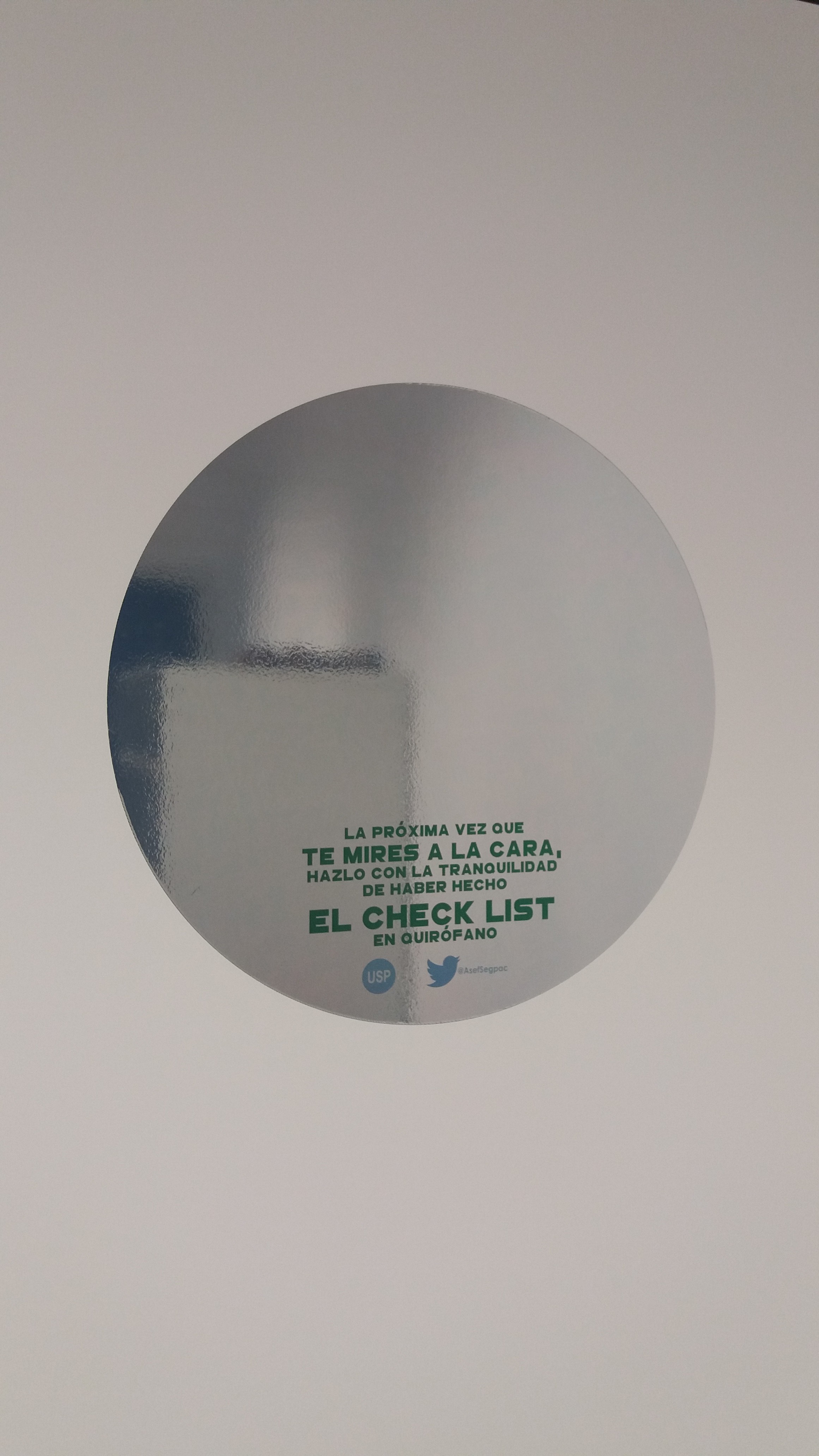 La campaña iniciada hoy consiste en la colocación de unos espejos en las puertas de los vestuarios, en el que se mirarán los profesionales al cruzar hacia el área quirúrgica y que tiene sobreimpreso un texto que dice “La próxima vez que te mires a la cara hazlo con la tranquilidad de haber hecho el checklist en quirófano”. Es una iniciativa más de la USP que trata de aumentar la práctica segura del checklist en quirófano.