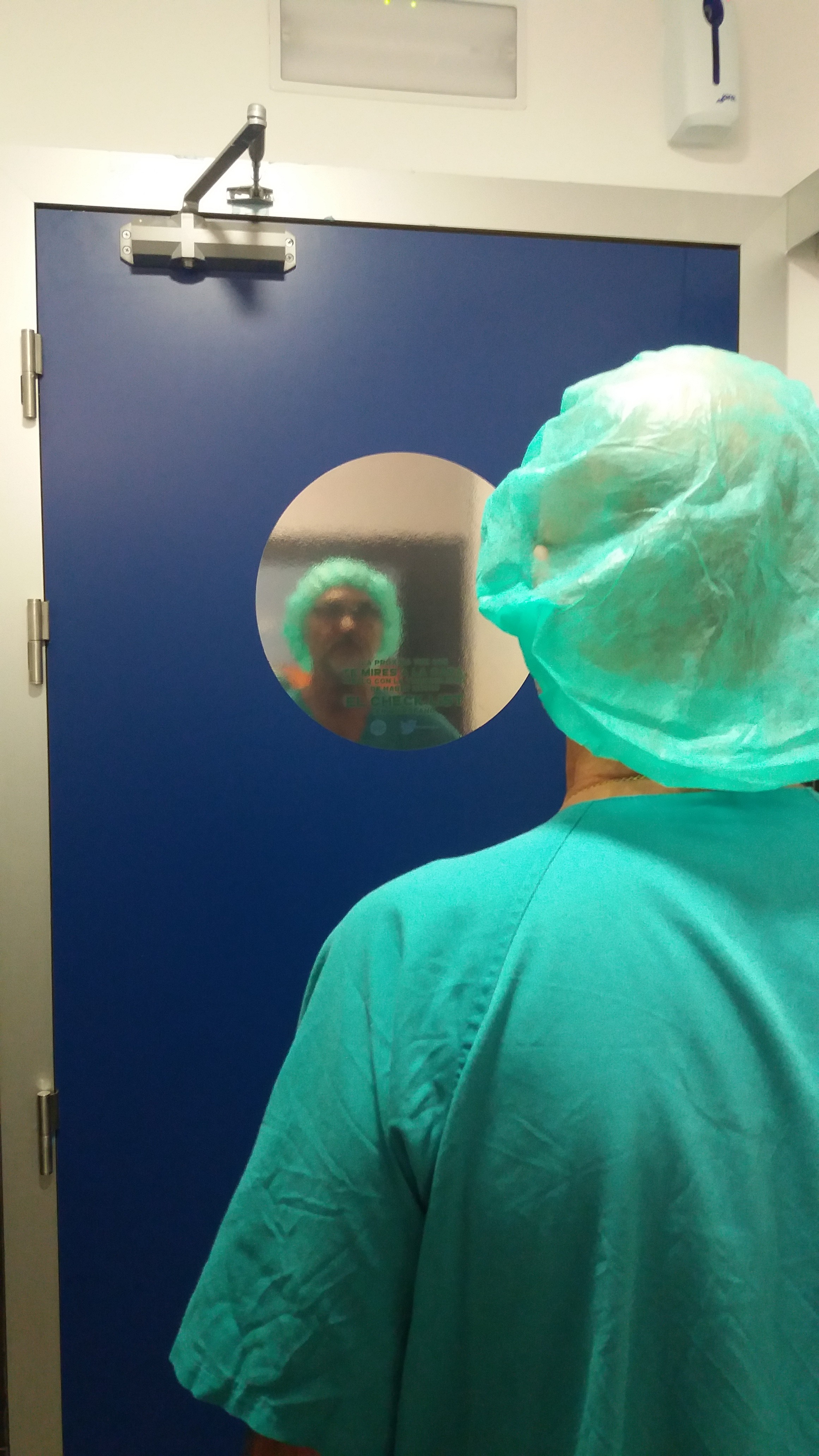Un médico frente a uno de los espejos que recuerda la necesidad de realizar un ‘checklist’.