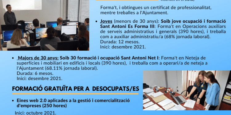 En el mes de diciembre empezarán en el municipio los programas mixtos Soib joven ocupación y formación Sant Antoni es Forma III (para menores de 30 años) y Soib 30 formación y ocupación Sant Antoni Net I (dirigido a mayores de 30 años). Estos programas combinan formación y trabajo, por lo que los alumnos trabajarán en el Ayuntamiento mientras se forman para obtener una titulación. En el caso de los menores de 30, durante 12 meses se formarán en el certificado de profesionalidad Operaciones auxiliares de servicios administrativos y generales, y trabajarán como auxiliares administrativos. Los mayores de 30 años se formarán en Limpieza de superficies y mobiliario en edificios y locales y harán trabajo como peones de limpieza durante 6 meses.