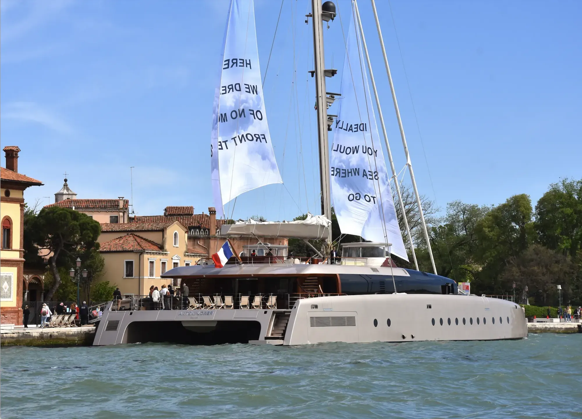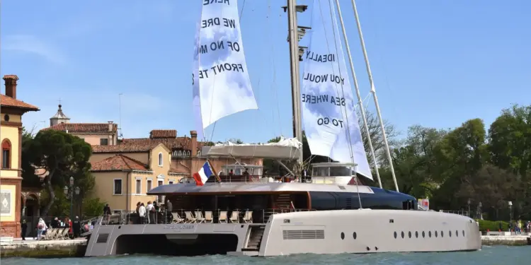 Diseñado por los arquitectos Axel de Beaufort y Guillaume Verdier, el catamarán de vela de 47 metros de largo puede albergar hasta 2.000 visitantes al día.