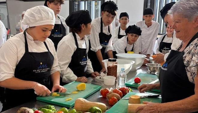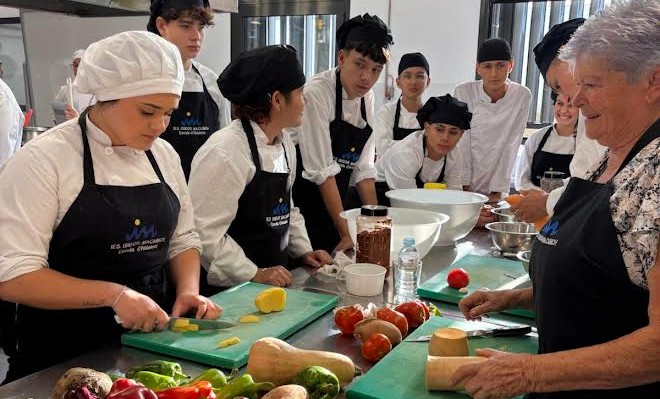 La segunda parte fue una demostración práctica protagonizada por Antònia Torres, agricultora de San Mateu de más de 80 años, quien elaboró en directo una receta tradicional ibicenca con productos locales y ecológicos. Su intervención permitió al alumnado conocer de primera mano los saberes culinarios transmitidos de generación en generación, reivindicando el rol fundamental de las mujeres mayores como guardianas de la cultura gastronómica de la isla.