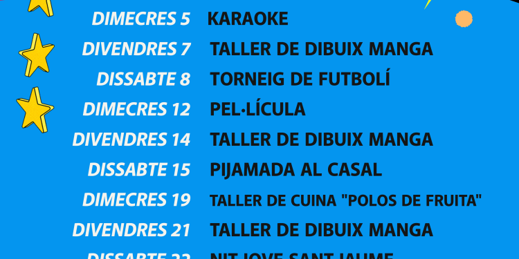El dimecres 19 de juliol tots aquells joves interessats podran aprendre a elaborar polos de fruita en el nostre Taller de Cuina mentre que el dissabte 22, ja immersos en les festes de Sant Jaume, l’activitat Nit Jove Sant Jaume servirà per a poder gaudir de la música en viu amb un concert dirigit als més joves.