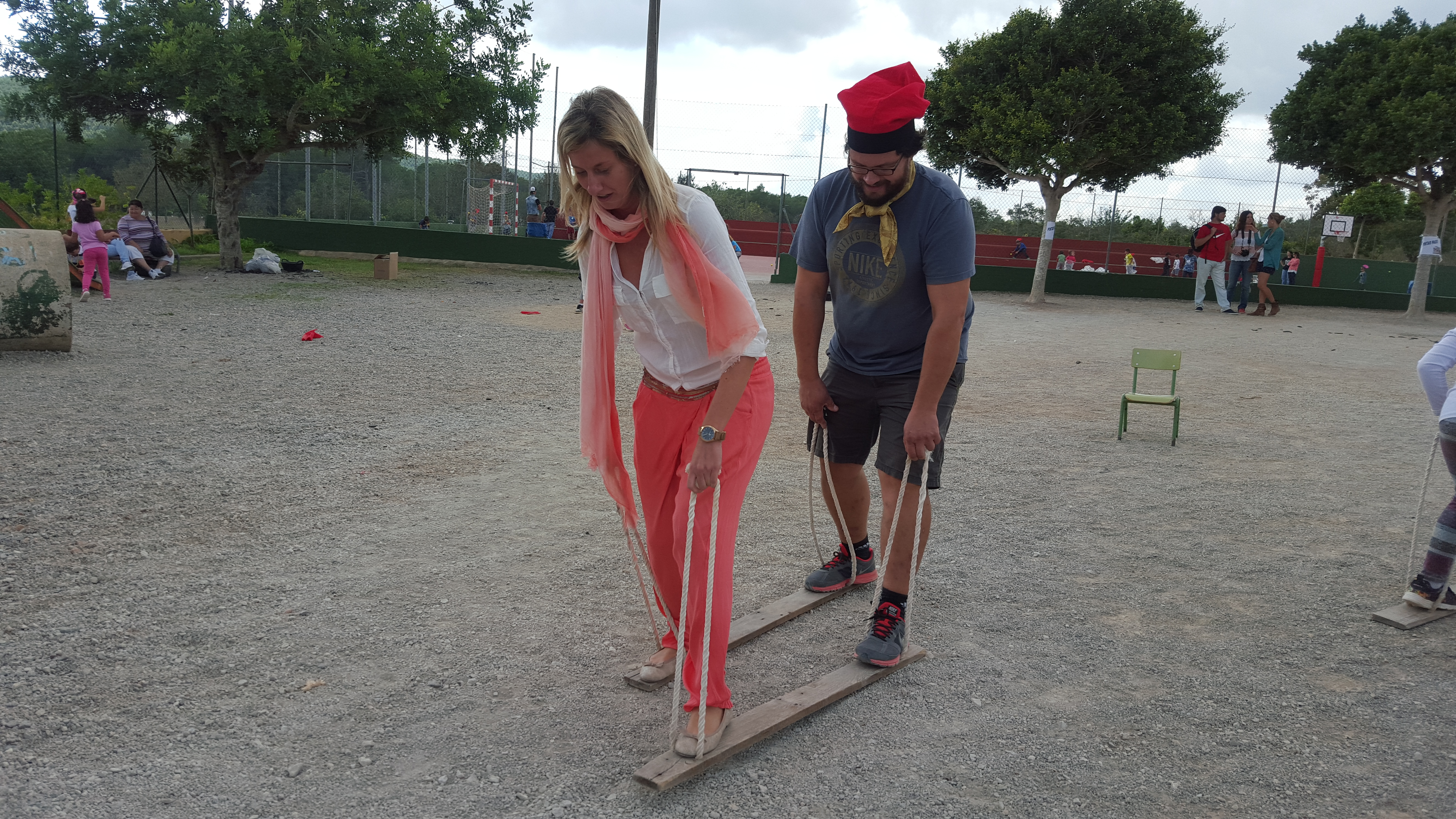 A media mañana, y después de desayunar productos ibicencos, los alumnos han podido jugar y competir en la carrera de sacos, practicar el ski pagès o transportar algarrobas.