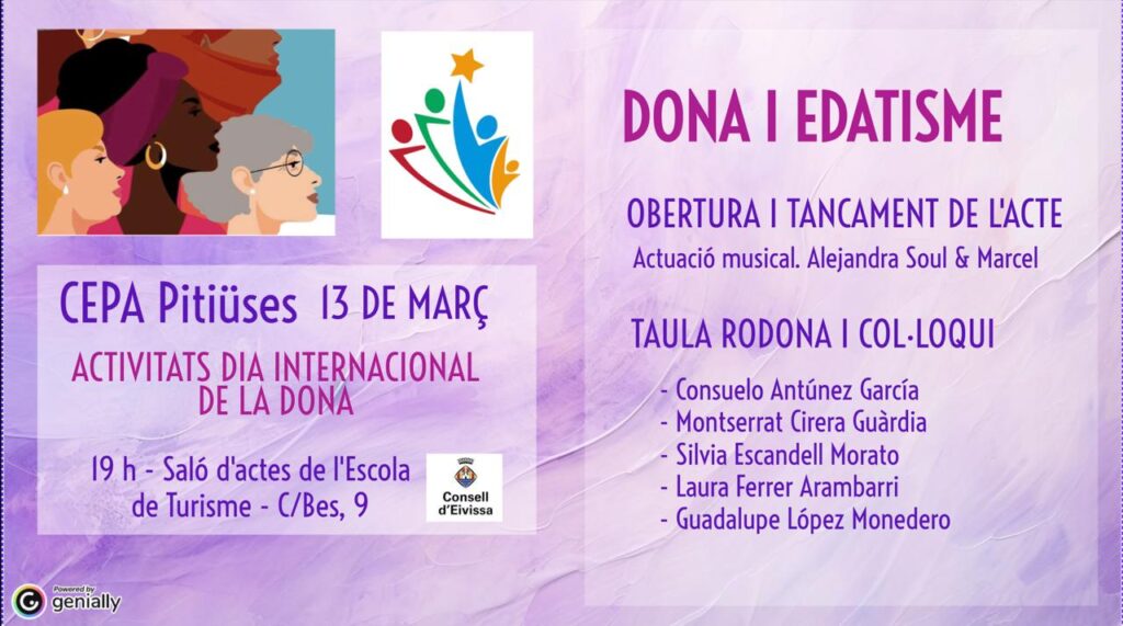 El Centro de Educación de Personas Adultas (CEPA) Pitiüses celebrará mañana, 13 de marzo, una mesa redonda bajo el título Dona i edatisme, una actividad enmarcada en la programación por el Día Internacional de la Mujer del 8 de marzo y que también incluirá un encuentro sobre nutrición y salud en la mujer mayor con Bárbara Munar el 27 de marzo.