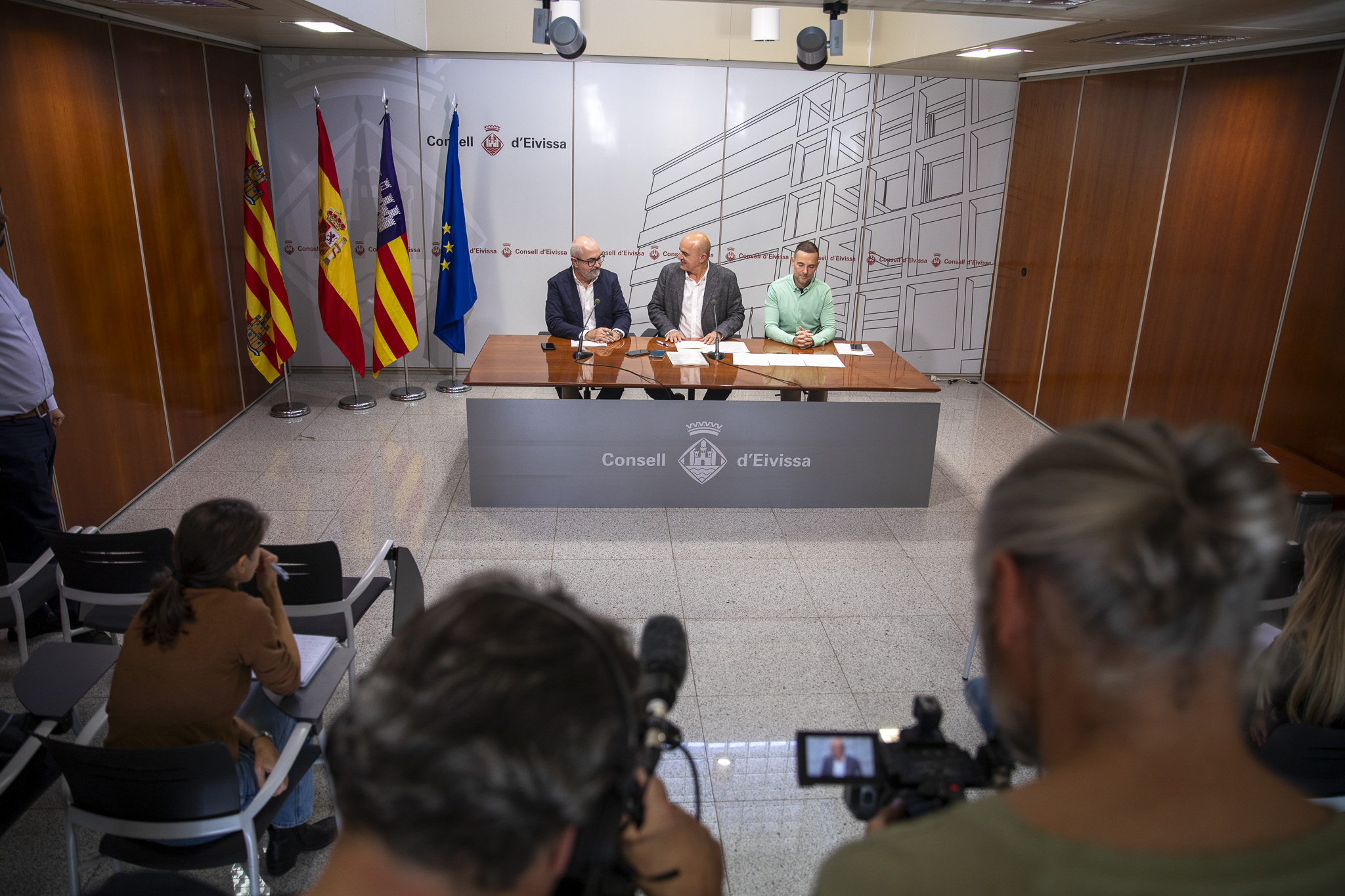 La rueda de prensa en el Consell en la que se ha presentado la aprobación de las Normas, con el alcalde de Sant Josep, Vicent Roig, el alcalde del Consell, Vicent Marí, y el vicepresidente del Consell, Mariano Juan. / CIE