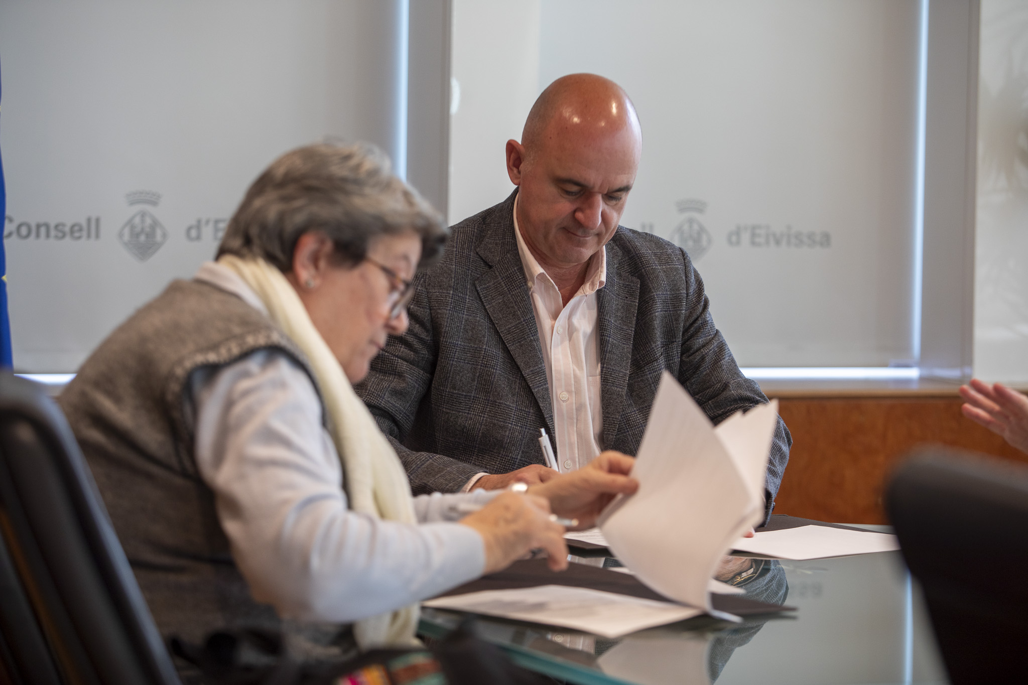 El presidente del Consell Insular, Vicent Marí, y la directora de Terciàries Trinitàries Casa de Santa Eulària, Maria Planells, han firmado este miércoles el acuerdo de acción concertada para la prestación del servicio.