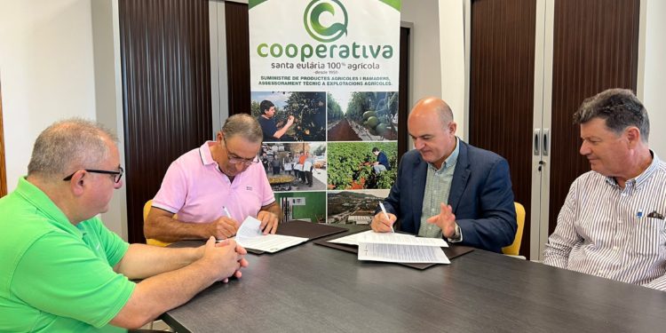 El president del Consell Insular d’Eivissa, Vicent Marí, i els presidents de la Cooperativa Agrícola de Santa Eulària, José Colomar, i el de la Cooperativa Agrícola de Sant Antoni, Juan Tur, han signat avui dos convenis per un import de 200.000 euros cadascun per tal de donar suport econòmic al sector primari d’Eivissa.