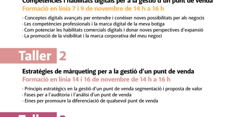 La consultoria Focalizza, encarregada de l’elaboració del Pla i especialitzada en el desenvolupament de l’activitat comercial, impartirà aquests tallers que se celebraran de manera telemàtica. El primer dels tallers, Competències i habilitats digitals per a la gestió d’un punt de venda, s’impartirà els dies 7 i 9 de novembre; el següent, Estratègies de màrqueting per a la gestió d’un punt de venda, serà el 14 i el 16 de novembre, i el tercer i últim, Deu accions per fidelitzar la clientela a l’illa, està programat per als dies 21 i 23 de novembre.